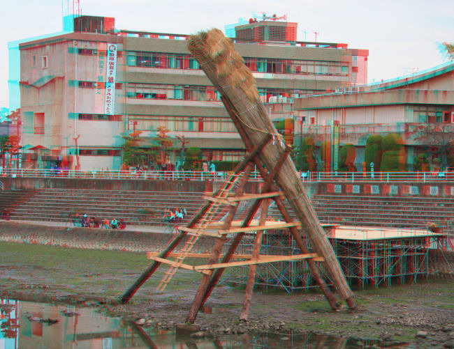 川の中に建てられたたいまつは長さ16m 重さ5トンの巨大なもので先端は直径2まある大たいまつです。