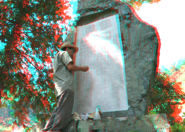 敵がいの碑の拓本をとる四教堂塾長の佐藤氏