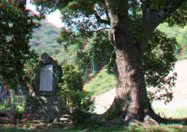 大きな楠の左遠くにあるのは巨大な敵がい(敵を憎む)の碑です