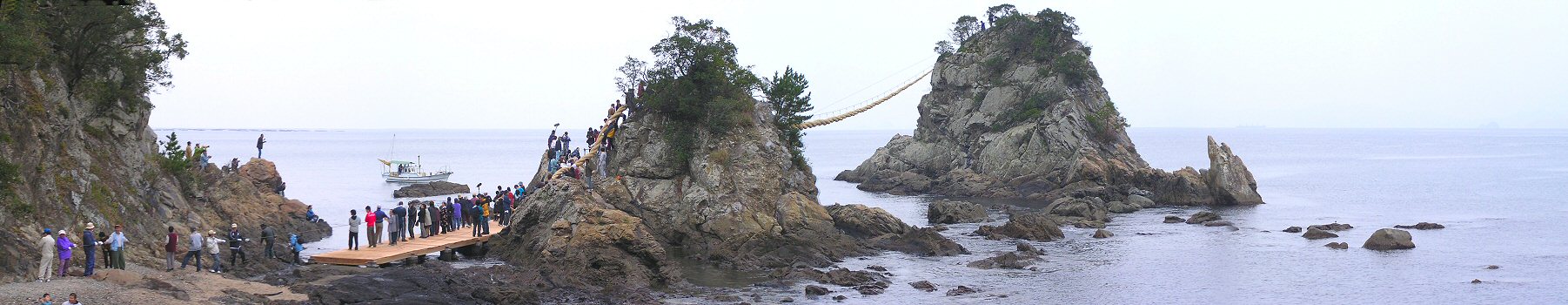 雌岩から雄岩(高さ17m 間隔65m)にしめ縄を張っていきます
