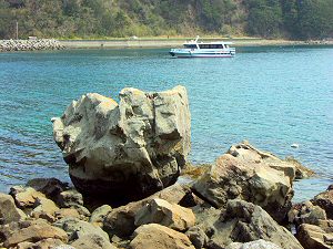「おお、島が見える。漁師たちの船もいる。あの島で水をもとめよう。」いく日ものこうかいに、飲み水をつかいはたしたみ船は、佐伯湾の大入島によって船をつなぎ、天皇は、おとものものたちとともに上陸された。