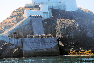| 水の子島灯台の電源は波力発電と太陽光発電を 組み合わせたハイブリッド電源システムを利用し 季節や天候に左右されずに安定した電力を 確保しています 二酸化炭素の排出もなく発電機の燃料も 運搬する必要もなく完全無人化が 実現しています |