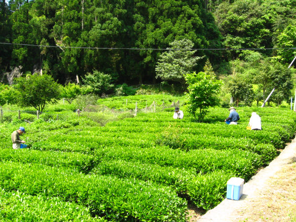 すがすがしい緑の茶園で懸命に茶摘みをいたしました。 天気は最高。