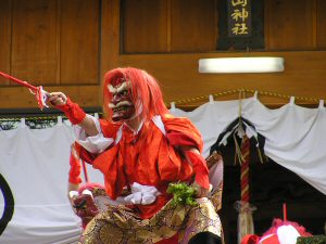 | 舞台では可愛いひょっとこ踊り | 荒神さまが山神社から降りてきます | |