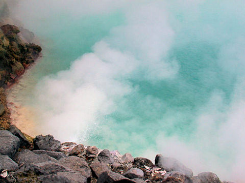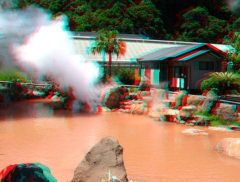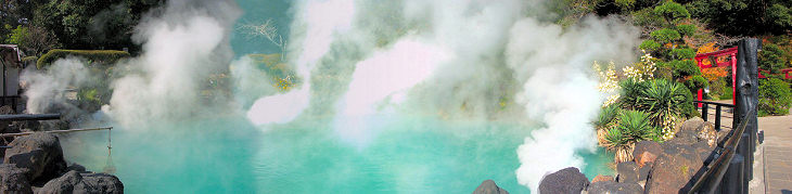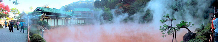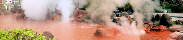 別府温泉には、含有物によって青、赤、白などの様々な泉色を呈する温泉や、間欠泉などの