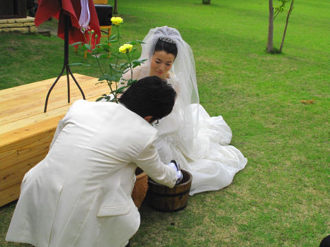 花の好きな息子の希望で本日大神ファームで結婚式です バラの花を鉢に植える最初の共同作業