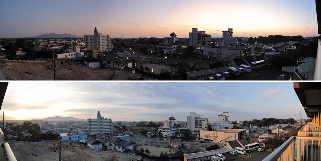 2011年12月27日と28日 玉名温泉立願時ホテルの上が夕方 下が朝の風景