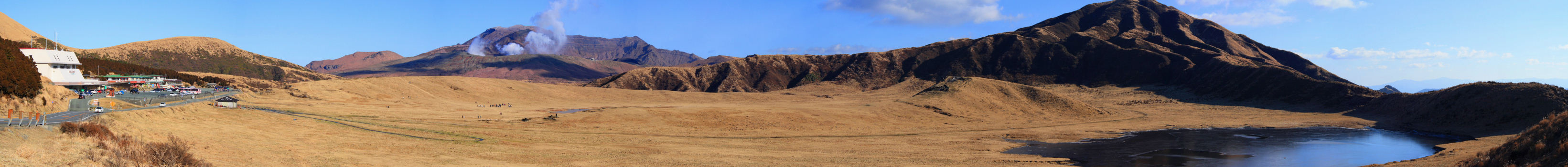 2008年12月26日 阿蘇の噴煙と草千里が浜と烏帽子岳 午後なのに池の水はまだ凍っています。