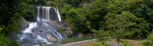 竜門の滝は中間に滝壷がある二段落としの滝で、全体としては幅40m、落差20mの滝です。