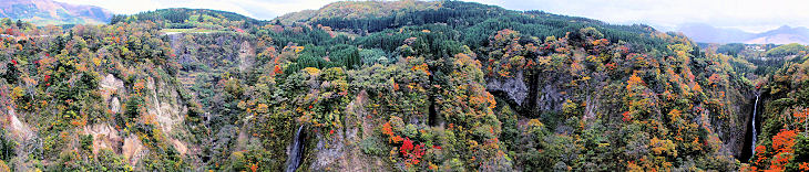 玖珠川上流の鳴子川渓谷にかかる「九重”夢”大吊橋」は長さ390m 高さ173mで人道専用の吊橋としてはいずれも日本一の規模で、観光客も多いところです。 吊橋の中央付近からは 日本の滝百選の震動の滝 男滝と女滝二つの滝を同時に眺める事が出来ます。