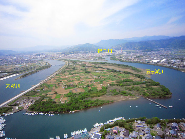 河口は北(きた)川、祝子(ほうり)川と合流して延岡平野の複合三角州をつくり、延岡市では、本流と
