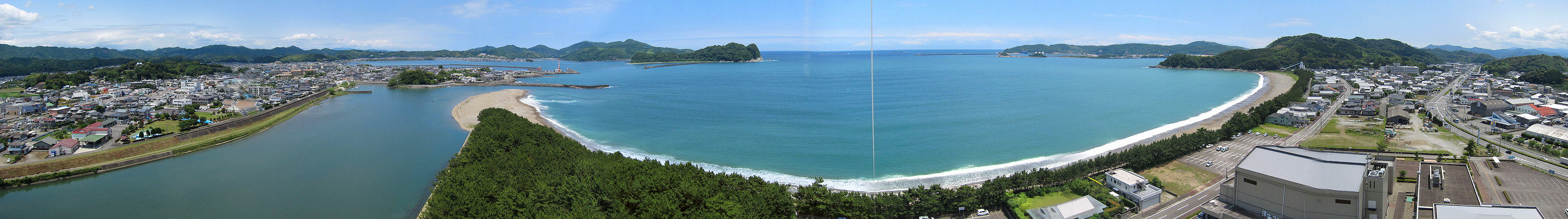 門川文化会館隣の公園から凧で五十鈴川と日向灘をパノラマに