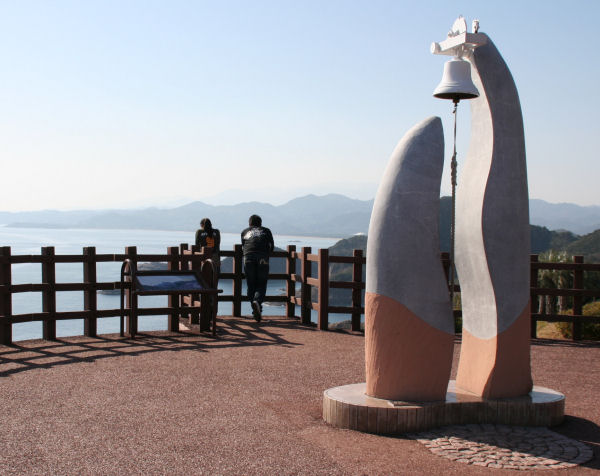 丘の展望台から遥か下の海を眺めると 十字架(クルス)のような見事な自然の造形です 向こうの小岩も見立てると叶うという文字にも見える事から 「願いが叶う」クルスの鐘もあり 鐘を鳴らす若いカップルの願いが叶うそうですよ 管理人は健康を願いました