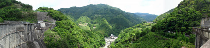 | 上椎葉ダムは昭和30年に完成した日本最初のアーチ式ダムです ダムの高さは110mダムの長さは341mで9200万立方mの水を貯められます。 |