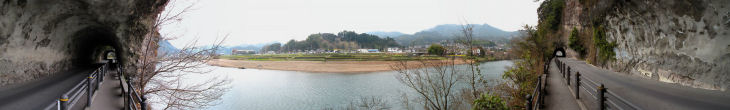 | 競い合うように立つ8つの岩からなる競秀峰は本耶馬渓を 代表する景勝地です。 その下は山国川で平行して青の洞門があります。 菊池寛の小説「恩讐の彼方に」の舞台として知られます、 禅海和尚がノミと槌だけで30年の長い年月をかけ 完成させたトンネルが「青の洞門」です。 ![]() |