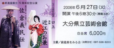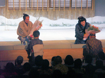 前進座75周年記念公演を見に来ました 素晴らしい歌舞伎の公演と踊りで感激しました 佐倉義民伝終了後花束を受ける主演の嵐圭史さんと瀬川菊之丞さん この公演を見に来ませんかとメールで誘ってくれたのは前進座の女優で大分出身の 江林智施さんです パノラマンが江林智施さんの舞台を見たのは 16年秋に大分市のグランシアタで開催された 「よみがえれ三浦梅園 玄語の森」で嵐圭史さんと共演した舞台です その後すぐパノラマンさんのファンですと知らされました。