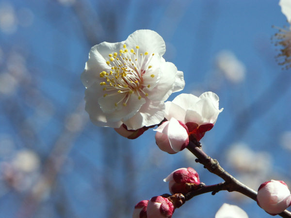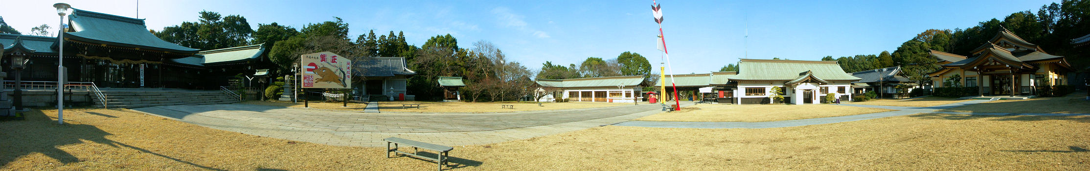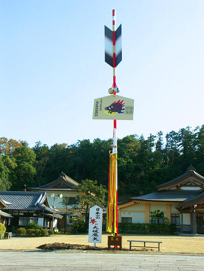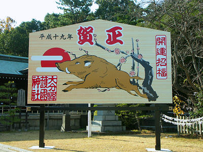 九州一大きな来年の干支の絵馬 日本一大きな(11.2m)破魔矢 絵馬に描かれているのは境内の豊後梅です 普通の梅より咲くのが遅く3月初旬から中旬です 普通の梅より一回り大きいのが特徴で大分県の木・県花となっています