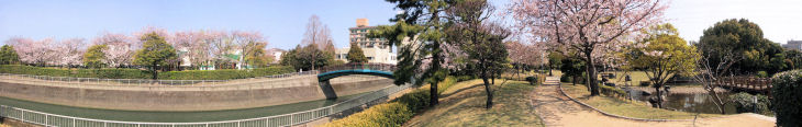 裏川沿いにソメイヨシノや八重桜など800本以上の桜を植栽し、季節に応じた花を植えるなど