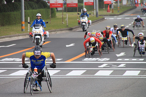 選手はレーサーと呼ばれる競技用車いす(7kgと軽量にしたのもある)に乗り、それぞれ工夫をした手袋をし、車輪についたハンドトリムをたたくようにして走ります。
