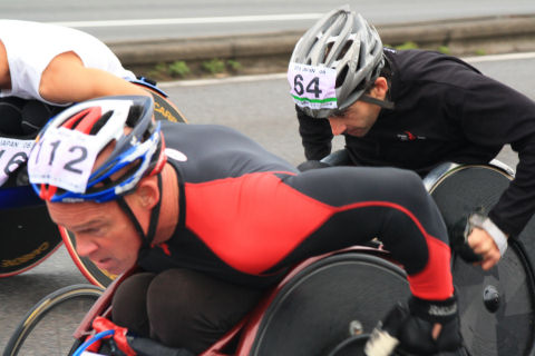 車いすのトップクラスのランナーは42.195kmを1時間20分余りで走ります。