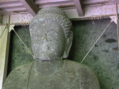 左の石窟の磨崖仏(平安末期の作) 右の石窟は 高さ約6m、奥行き約7mの石窟で、 中に像高3mの丸彫りの大日如来があります 大日如来のお顔 ちょっと東にある崖に作られた龕(がん)