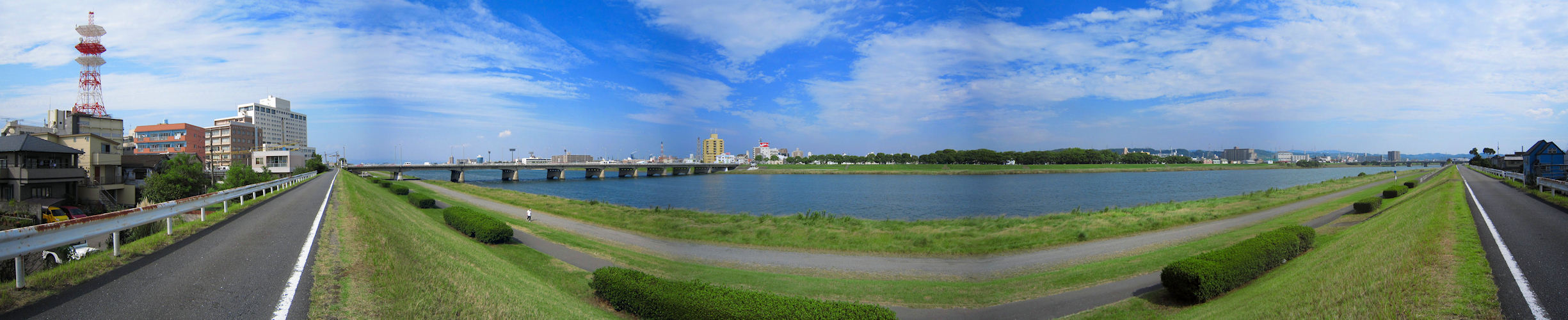 2011年10月6日 大分川の西堤防長浜の堤防からです。 普段使うカメラではなくマニュアル露出のない小型デジカメですから 露出が合わず パノラマ接続部分が暗くなっています。 空撮に来ました。