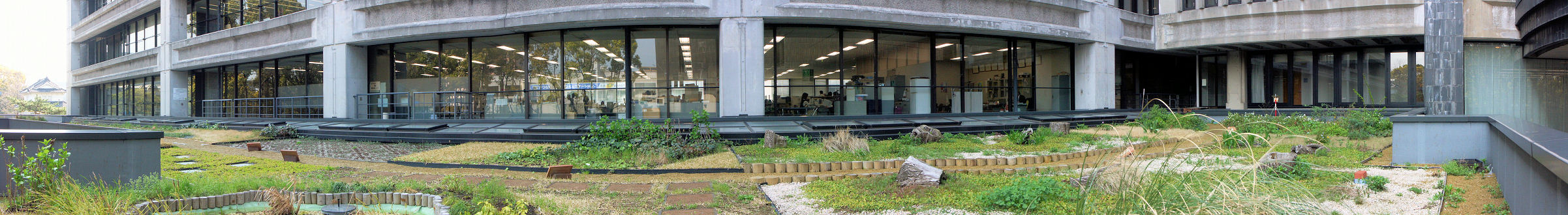 庁舎増築部屋上に野草などを植栽し 屋上緑化実験をしています