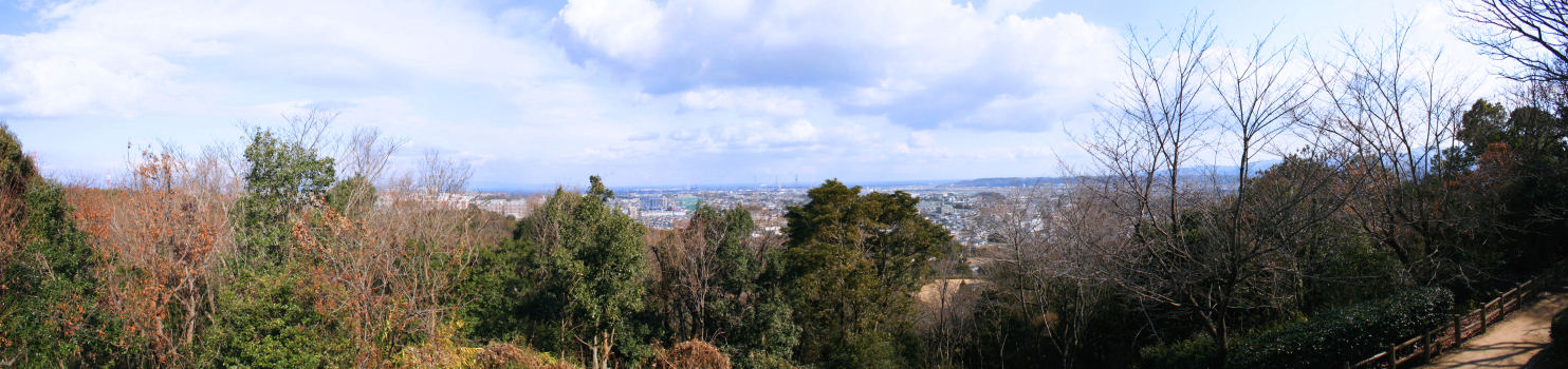 高尾山の頂上(標高127m)にある展望台から木々の上に若干東部の市街が見えます