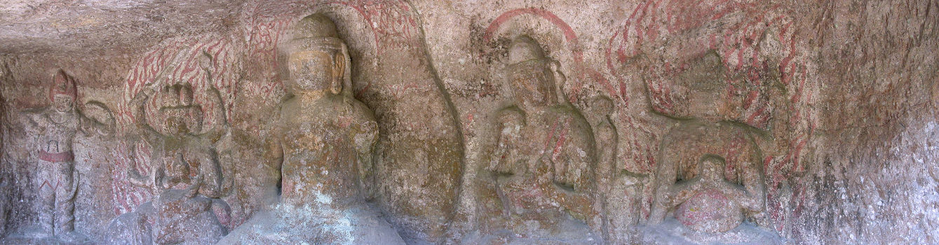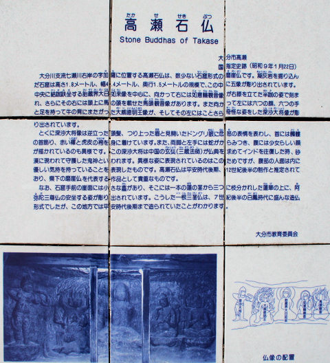 平安時代の作で 5体の磨崖仏が彫り出されています。左より深沙大将像(しんじゃたいしょうぞう)、 大威徳明王像(だいいとくみょうおうぞう)、大日如来像(だいにちにょらいぞう)、 如意輪観音像(にょいりんかんのんぞう)、馬頭観音象(ばとうかんのんぞう)となっています