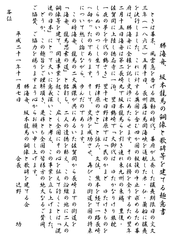 | この意気で鶴崎に勝海舟と坂本龍馬の銅像と歌碑が建つといいですね 皆様のご協力 お願いいたします。 |