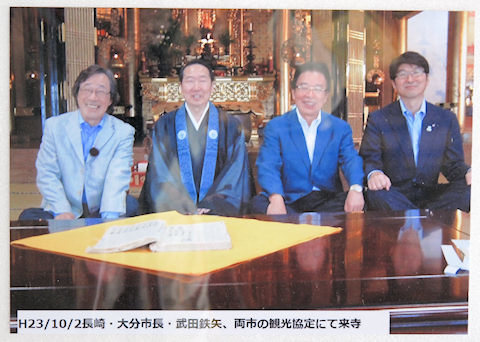 平成23年10月2日田上長崎市長と武田鉄矢氏が徳応寺を訪れていますが この交流のきっかけは鶴崎の郷土史家の北川氏と私(パノラマン)が長崎の 坂本龍馬銅像建立20周年で長崎を訪れた事が始まりです