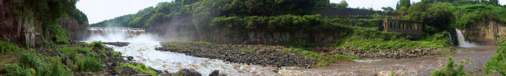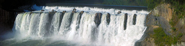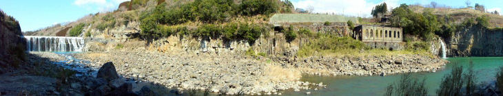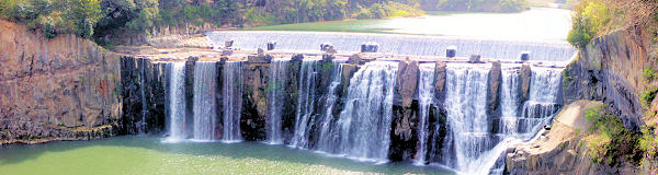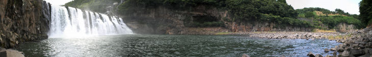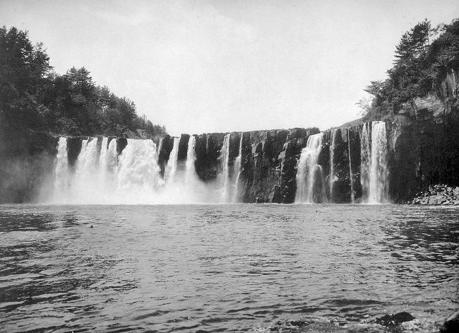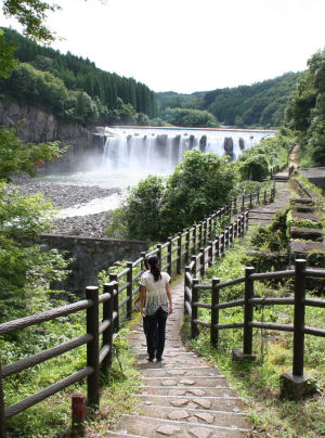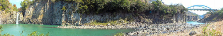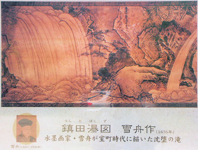 沈堕の滝は高さ17m 幅110mと雄滝と幅4mの雌滝の2つの滝があります。 水墨画の大家雪舟の描いた「沈堕瀑図」のモデルとして知られています。 1909年(明治42年)に発電所の取水用に雄滝の上に堰が設けられ、1923年(大正12年)には堰がかさ上げされたため往時の景観が損なわれたが、1996年(平成8年)からの堰堤強化工事に伴い、常に水が流れるようになり、かつての壮大な景観を取り戻しました。 雄滝と雌滝の間には、石造の沈堕発電所跡地(近代化遺産)があり遊歩道も整備されており滝周辺の景観を楽しめます。。 ![]() |