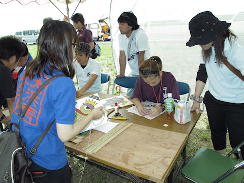 集まった地元の子供たちに凧作りを指導するスタッフ