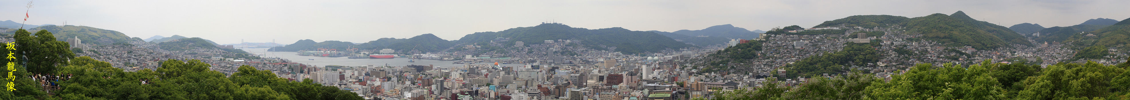 風頭公園展望台から坂本龍馬像と長崎の市街地風景をパノラマで