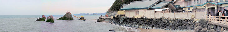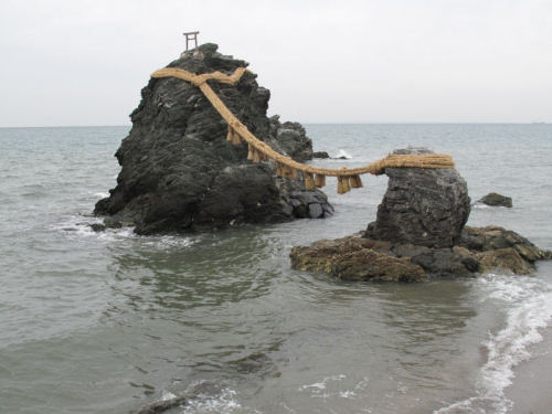 夫婦岩は、沖合い660mの海中に鎮まる興玉神石の鳥居と見なされており、日の出の遥拝所として古くからしられ、