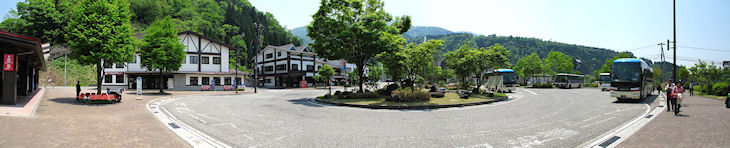 扇沢駅前には新潟県の糸魚川を通る道へ大きく迂回したバスが迎えに来てくれています