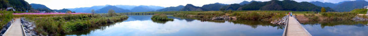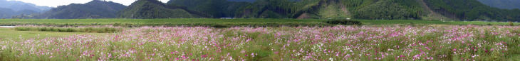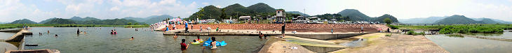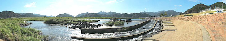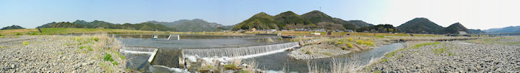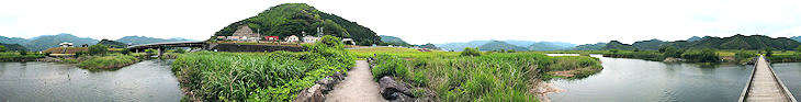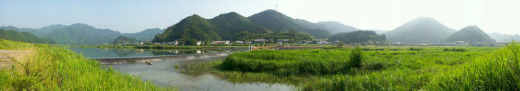 弥生の番匠川と道の駅やよい周辺のパノラマ風景写真