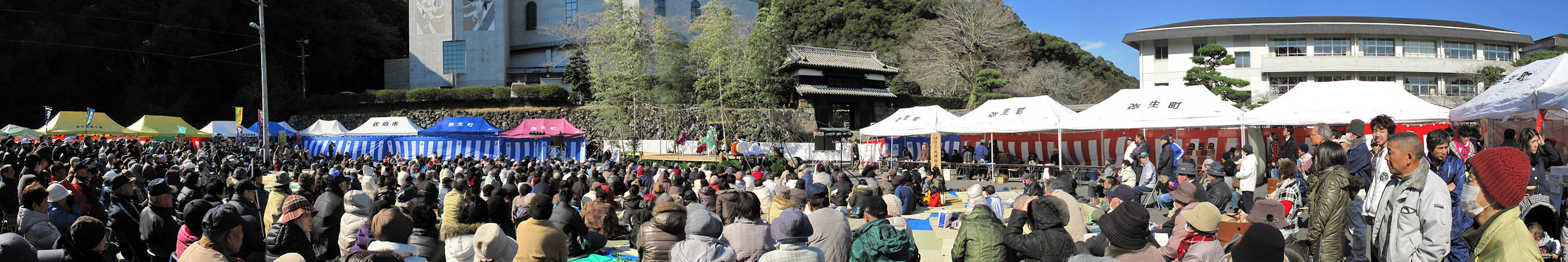 2012年2月4日 第2回目の神楽大会に集まった人々。佐伯神楽・日向系神楽・豊後大野系神楽が伝わっています。 江戸時代佐伯藩主が毎年2月の初午の日に城内稲荷神社(三の丸)で神楽を奉納した事にちなんで開催されます