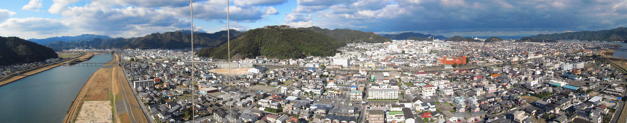 番匠川河川敷から凧を揚げて佐伯市を眺める