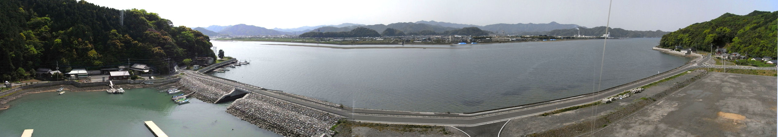 東灘埋立地から凧をあげて番匠川を空撮パノラマ