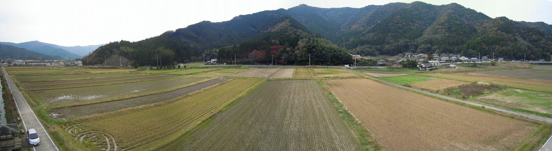 木立の農道からの空撮写真4枚を合成して作ったパノラマ