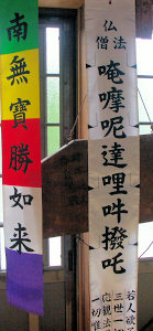 祈祷札の文字 書こうと思ったのですが ??パソコンで出ない文字?? 「おんまにだりうんはった」 と書かれているそうです 虫供養施餓鬼は祀りてのない無縁仏や、この世に 心を残して死んだ人の怨霊は追善供養などされず 魂は巷をさまよい 稲虫となって田畑を荒らすと 考えられ、これらに静かにして貰うため供養するのであるとの事 祈祷札は稲田に立て害虫を仏の力で圧伏させるための ものだそうです 佐伯史談会の五十川千代見さんの 「大越川流域の民俗と信仰」という本より |
