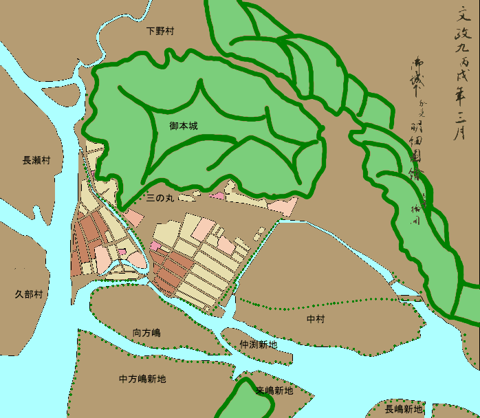 下の地図は文政9年(今から180年前)の御城下分見明細図絵(佐伯藩資料 温故知新録一付図)