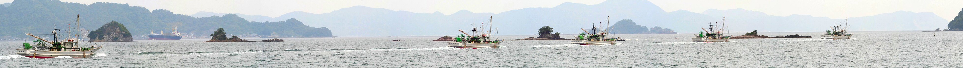 吹浦を出港した漁船と三栗島・納地島・片白島