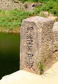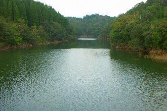 ここは北川ダム上流で この画面一番右の石橋は明治41年に完成した石橋です 普段はダムの湖底に沈んでいるはずですが 最近雨が少なく 昔の田代橋が湖面に出ています 立派な石橋です 2005年7月28日