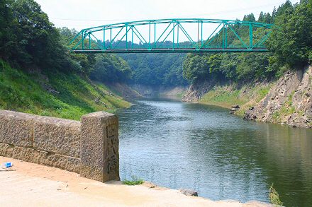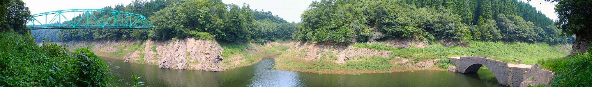 ダムに沈んでいるはずの石橋から新しい田代橋を眺める