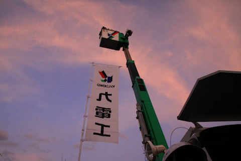この作業車のバケットからパノラマ撮影しました 暗くなっており手持ち撮影なので写真はぶれていて 下手な写真ですがなんとかパノラマにつなぎました。