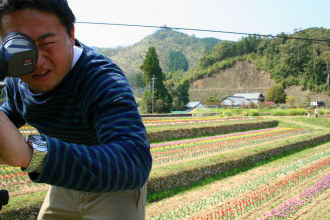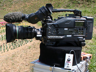 きょうは満開のチューリップを撮影に来たパノラマンをNHKのニュースカメラマンが取材 こちらはNHKとソニーが開発したハイビジョンカメラお値段も800万円とかレンズはキャノンです その下の台はリモコンでカメラを回転させパノラマ撮影出来る台です パノラマンも興味しんしん