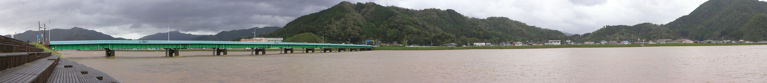 台風で増水した時の番匠川です、パノラマンは木立に住んでいて蛇崎が浸かった為に車が数時間通れませんでした しばらく待って水が引いてからの撮影ですから実際は濁流が橋桁にぶつかるくらい危険だったと思われます。