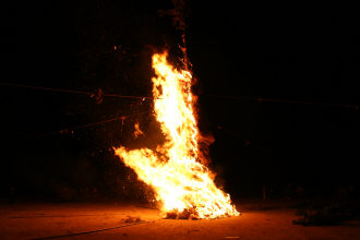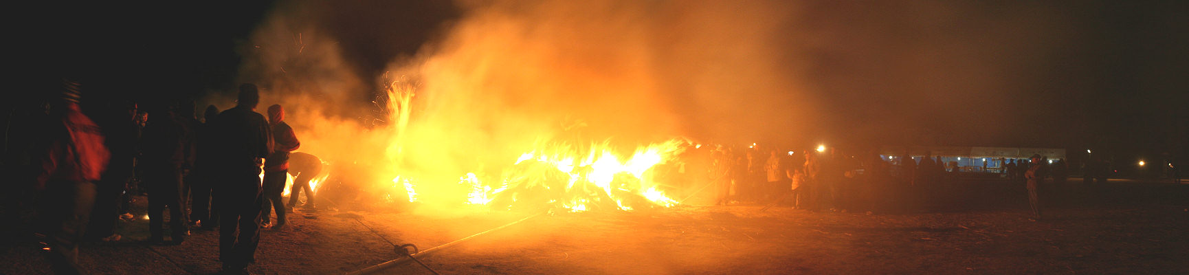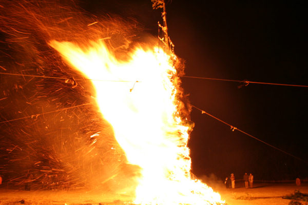 | 点火すると同時に一気に火柱が昇ります | パンパンと竹の割れる大きな音がして迫力満点 | |